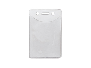 is a clear plastic badge holder with a vertical top load that hangs