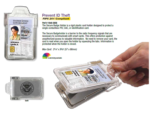 The Secure BadgeHolder is the only product that meets the FIPS 201 section 2.4 (PIV Privacy Requirements) and 4.4.2 (Biometric Data Represenation and Protection) for an electromagnetically opaque sleeve. Shields ISO 14443/15693 and EPC Gen1/Gen2 contactless smart cards.