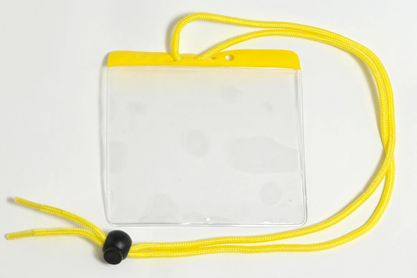 Government and Military ID card size ID badge holders with 36″ round neck cord, Yellow color trim and adjustable lock.