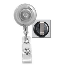 Translucent clear round ID badge reel with clear vinyl strap & belt clip. Reel diameter 1-1/4″ (32mm). Cord length 34″ (864mm). Minimum order 100 pieces.