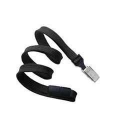 Black classic breakaway flat woven ID neck lanyard, 3/8″ wide, bulldog clip attachment.