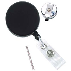 Heavy-duty ID badge reel Black and Chrome with reinforced vinyl strap and chain cord. Pack of 100.