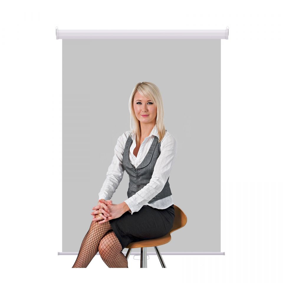 Retractable photo ID backdrop. Ideal for passport photos and photo ID card applications in space restricted settings. Can be hung or mounted to your wall or ceiling with built-in mounting brackets. Screws and bolts not included. Pull-down clutch mechanism locks retractable backdrop screen at any length. Seamless fabric with Laminated back.