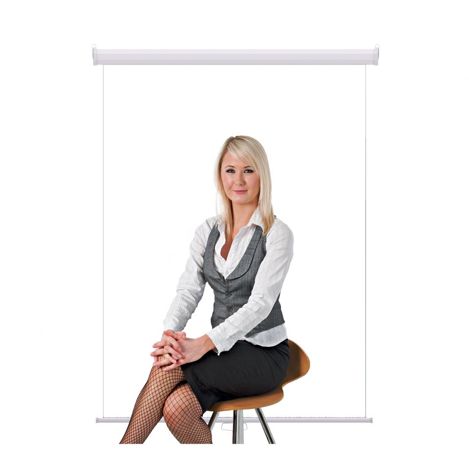 Retractable photo ID backdrop. Ideal for passport photos and photo ID card applications in space restricted settings. Can be hung or mounted to your wall or ceiling with built-in mounting brackets. Screws and bolts not included. Pull-down clutch mechanism locks retractable backdrop screen at any length. Seamless fabric with Laminated back.
